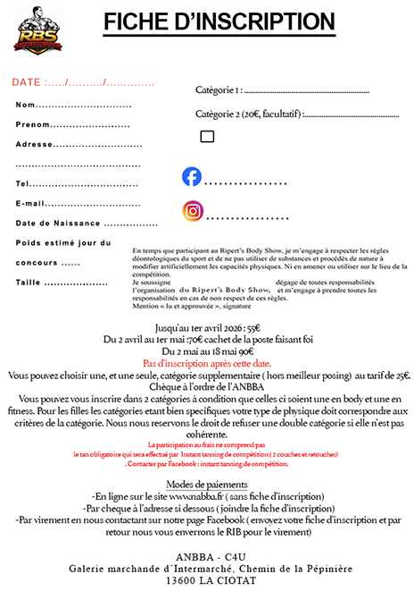 Pour tous les participants au Ripert’s Body Show 2026. Ceux qui seront sur place le vendredi , catégories body et Fitness, vous pouvez venir récupérer votre dossard sur les lieux de la compétition et de la pesée.