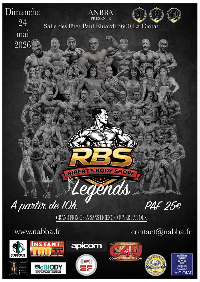 Le Ripert’s Body Show 2026 aura lieu le dimanche 24 mai 2026 à La Ciotat. Les inscriptions, toise et pesée se feront la veille sur place de 17h à 20h. Pour ceux qui ne font pas partie des catégories avec toise et pesée, il y a quand même la possibilité de venir le samedi. Sinon ce sera le dimanche matin à l’heure qui vous sera communiquée plus tard. Vous pourrez aussi mettre votre première couche te Tan avec notre partenaire Instant TAN tanning de compétition , le samedi entre 17h et 20H.