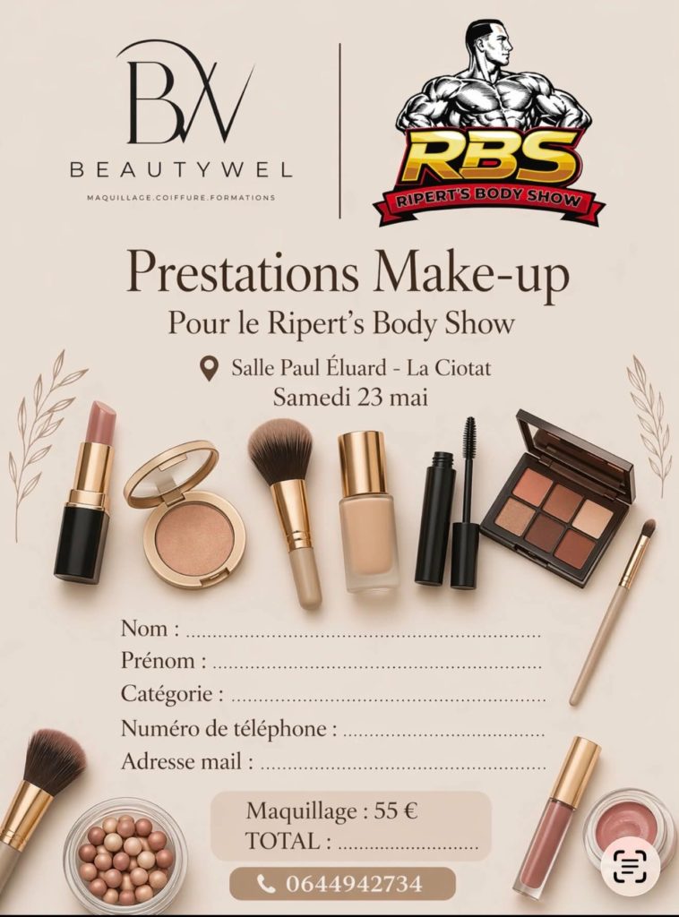 Le Ripert’s Body Show 2026 aura lieu le samedi 23 mai 2026 à La Ciotat. Les inscriptions, toise et pesée se feront la veille sur place de 17h à 20h. Pour ceux qui ne font pas partie des catégories avec toise et pesée, il y a quand même la possibilité de venir le samedi. Sinon ce sera le dimanche matin à l’heure qui vous sera communiquée plus tard. Vous pourrez aussi mettre votre première couche te Tan avec notre partenaire Instant TAN tanning de compétition , le vendredi entre 17h et 20H.